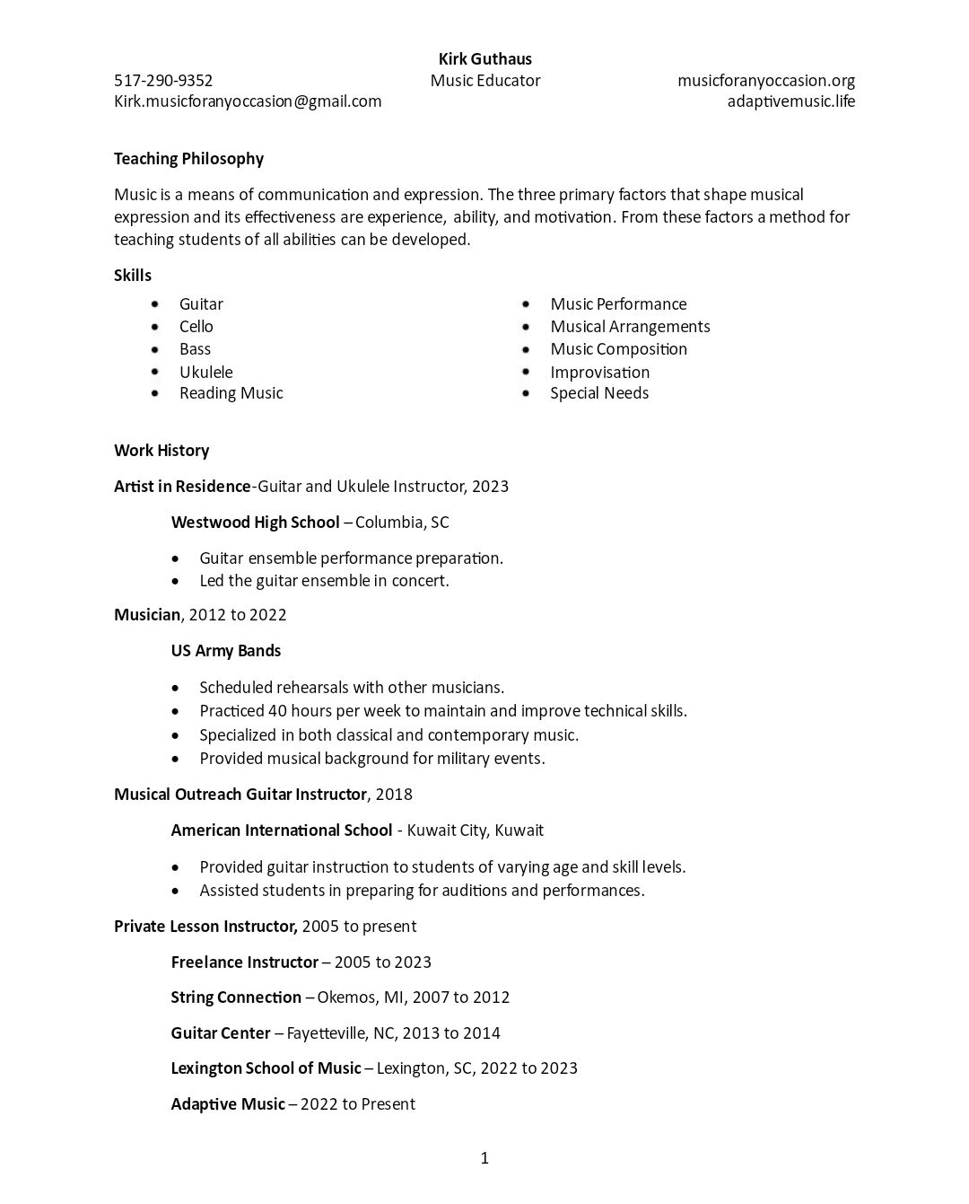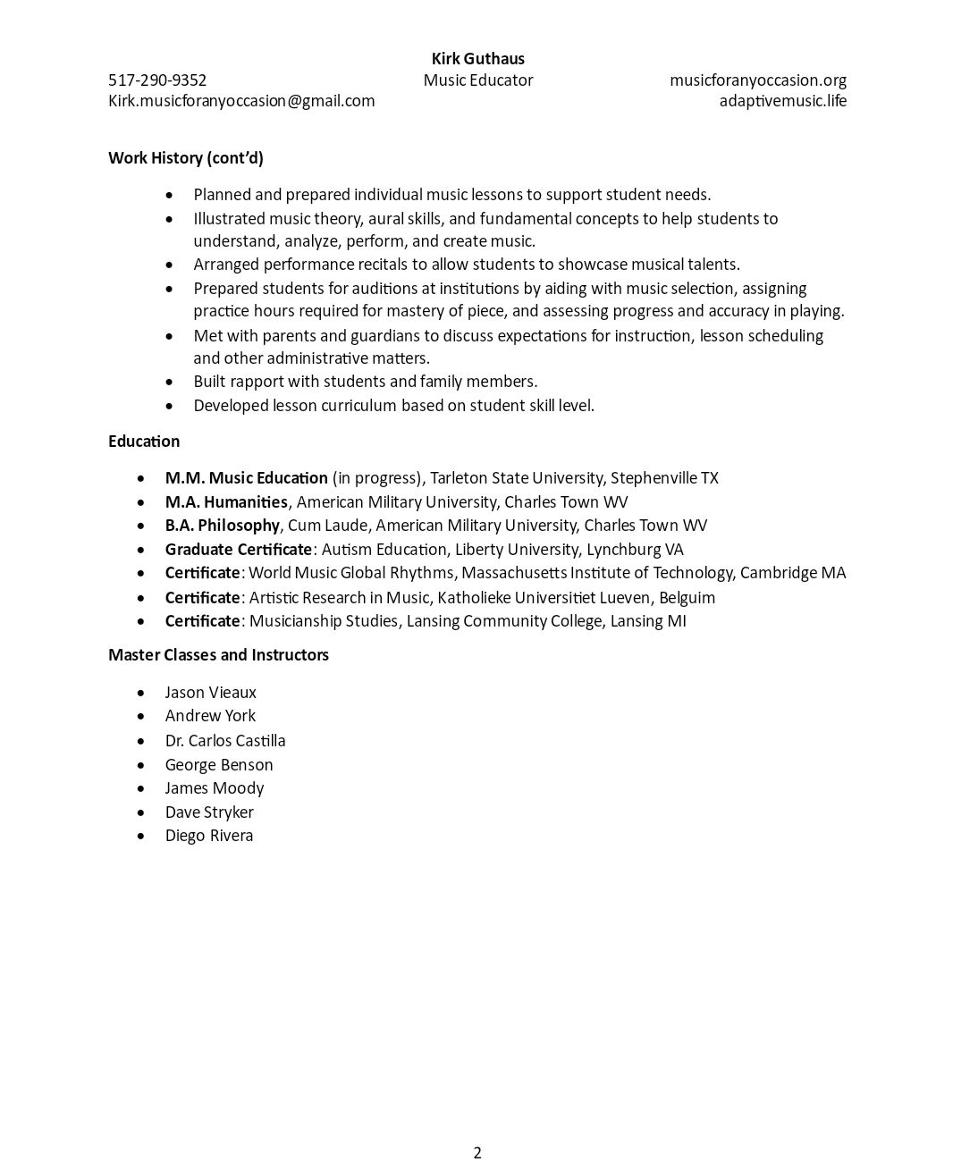 After my time in the Army, I transitioned into working in public education, focusing on special education, where I continue to integrate music into the classroom to support student growth and learning. I hold a Bachelor’s degree in Philosophy, a Master’s degree in Humanities, and certificates in Autism Education, Musicianship, Ethnomusicology, and Music Research. I am currently pursuing a Master of Music in Music Education to further strengthen my skills as both an educator and performer.